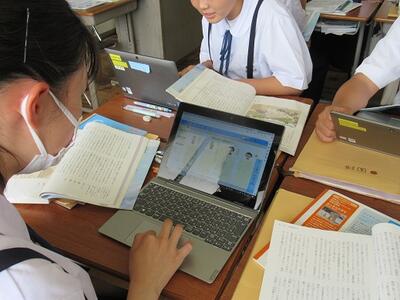 国語では、「百科事典少女(小川洋子)」の登場人物の人物像について、タブレットを使いながらまとめました。どのような表現に着目したらよいかをグループで話し合いながら活動していました。