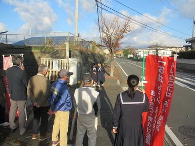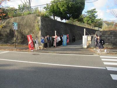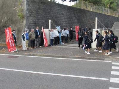 学校北門付近で、地域の方々と共にあいさつ運動を行いました。学校運営協議会での中で、生徒と地域の方々が協力してできることとして、まず、挨拶から始めようということで行いました。昨年度はあいにくの雨で、昇降口で行いましたが、今朝は温かな日差しの下、元気でさわやかなあいさつの声を響かせることができました。