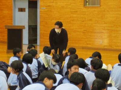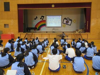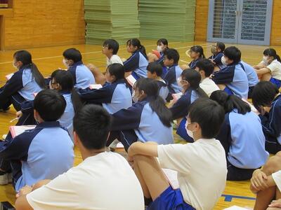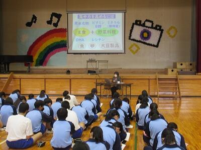 学校栄養士の先生を講師に迎え、「スポーツと食事について考えよう!」をテーマに、食に関する指導をしていただきました。部活動に頑張って取り組んでいる生徒にとって、とても興味深いテーマです。どの生徒もメモをとりながら一生懸命聞いていました。