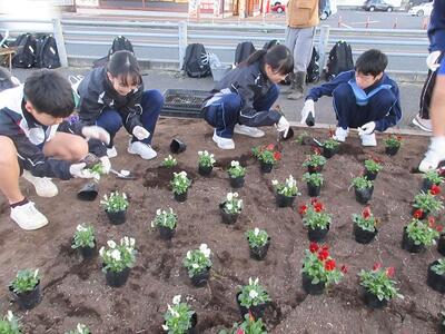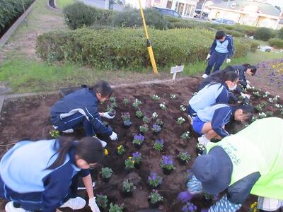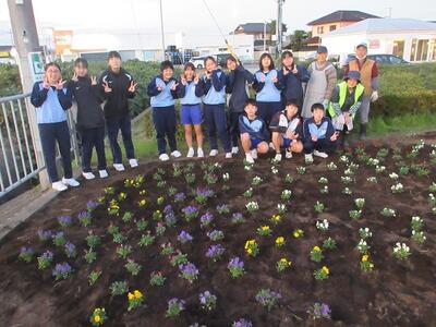 美術部の生徒が、6月に続き、地域の方と一緒に花壇を整備しました。ブーケをイメージして苗の植え方をデザインしたそうです。周辺を通る際に見ていただけると幸いです。