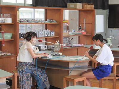 熱中症対策として、外の部活動は帽子をかぶり、中の部活動はエアコンを活用して行っています。もちろん、水分補給もしっかりと行っています。