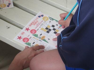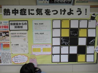 保健室前の様子です。生徒に熱中症について知ってもらおうと、保健の先生が工夫を凝らして作成しました。生徒も昼休みを利用して問題にチャレンジしています。