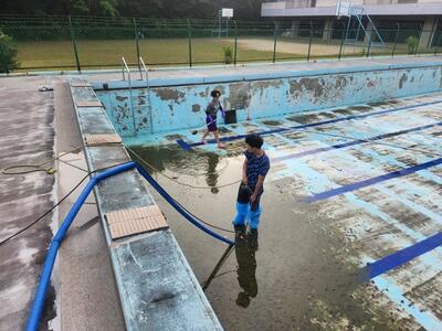 水泳学習に向けて、体育の先生は、プールの水を抜いています。期末テストが終わったら、担当学年が体育の時間にプール清掃を行います。