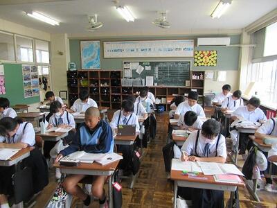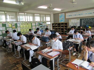 いよいよ県北総体が始まりましたが、今日、試合のない生徒や運動部に所属していない生徒などは、登校しています。吉報を待ちながら、ワークを進めたり、読書をしたりしました。こちらも、試合に臨むような真剣な態度で取り組めました。戦っている生徒たちへのエールとなったことでしょう。
