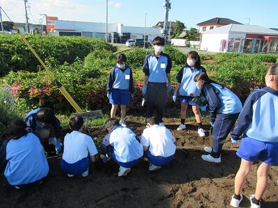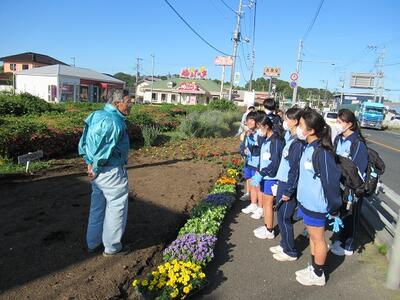 放課後、地域の方と一緒に、国道6号線十王駅入り口交差点そばの花壇の花の配置デザインを考え、苗を移えました。これから、花が咲き、どんな風になるのかとても楽しみです。