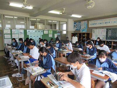 別の学年の社会科では、外国から見た日本の特徴についてグループで考え、タブレットを使ってまとめました。