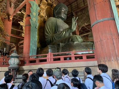 日差しが強く、暑い一日になりました。奈良では、多くの観光客とともに、大仏を見てきました。多少車酔いをした生徒がいましたが、旅館に着くと元気になりました。