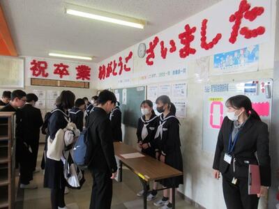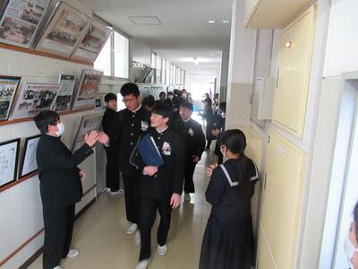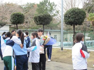 職員の異動が発表されました。本校では10時30分から11時30分の間をお別れの時間として設定しました。多くの生徒や保護者が感謝と異動先での活躍を願って来校し、気持ちを伝えていました。