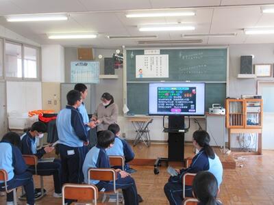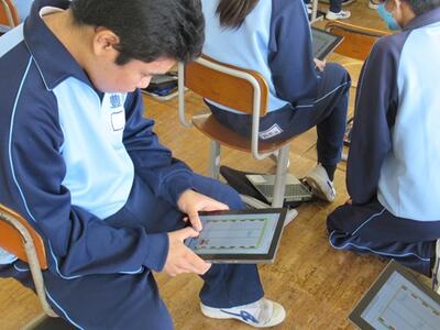 音楽ではまとめとして、Webアプリを使って既習事項の復習を行いました。ゲーム形式でできるので、生徒も楽しく取り組むことができました。