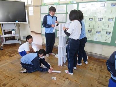 学級活動では、構成的グループエンカウンターとして、紙を工夫してどれだけ高く積み上げられるかを競い合いました。アイディアを出し合い、協力して随分高くまで積み上げていました。