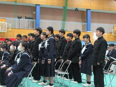 その後、着任式、始業式を行いました。始業式では、担任や部活動顧問の発表がありました。