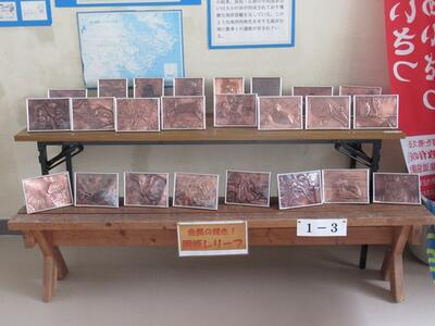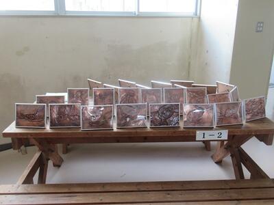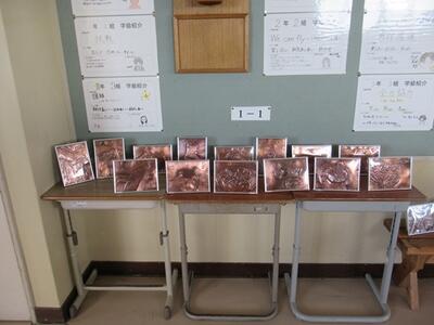 美術科の時間に「銅板レリーフ」を作成しました。一枚の銅板をたたいて凹凸をつけ、表現したいものを浮き上がらせました。力作ぞろいです。