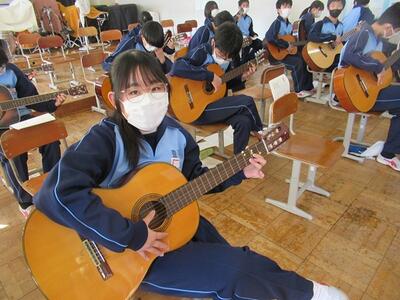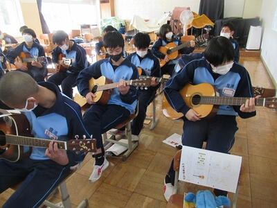 2年生の音楽科では、ギターの演奏を行いました。コードの指使いが難しいようでしたが、気分はミュージシャンで楽しく学習していました。