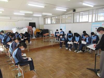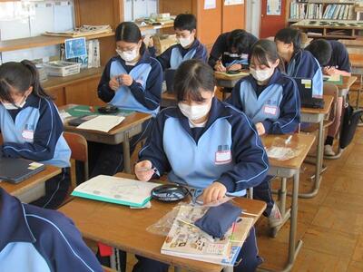 3年生は実力テストを行いました。問題配布の様子です。先生の「始め」の声を静かに待っています。