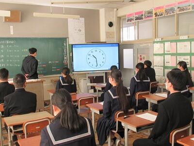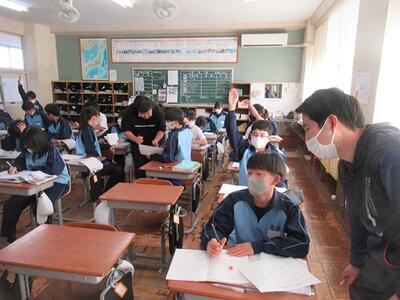 1年生の社会科では、地図の縮尺を学習しました。比を使っての計算に、数学の問題を解いているみたいと頑張りました。解けたら先生のチェックを受けます。たくさんの生徒が手を挙げて先生を呼んでいます。