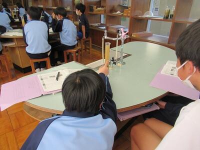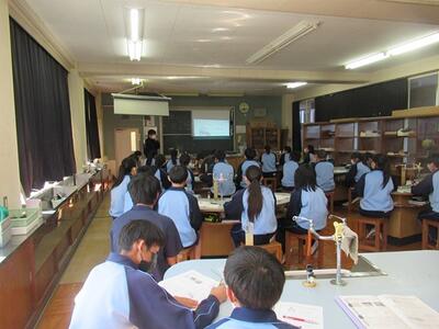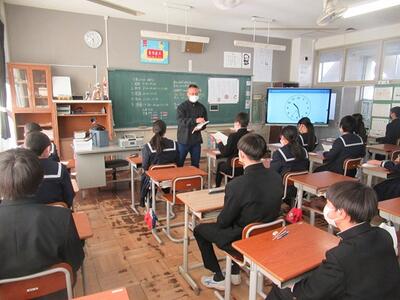 1年生の理科では、地震について学習しています。説明を受けながら、問題を解いていました。