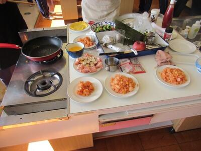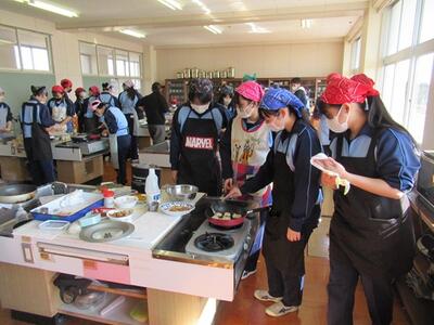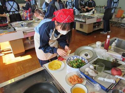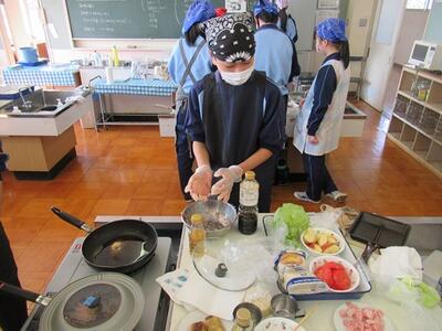 1年生の家庭科では、栄養教諭をお招きして、しゃけのちゃんちゃん焼きを作りました。2回目の調理実習だったので、時間内に調理、試食、片づけまでしっかりとできました。