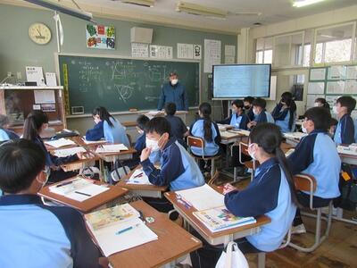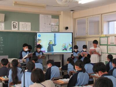 1年生の英語科では、電子黒板を使いながら、教科書を様子が伝わるように工夫しながら発表しました。合わせて、ビデオ撮影も行いました。
