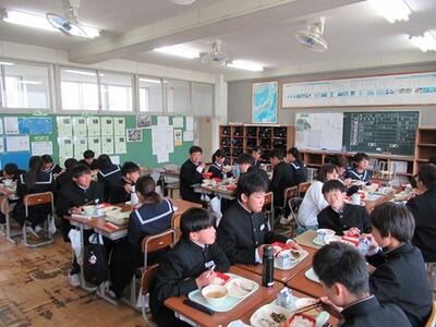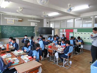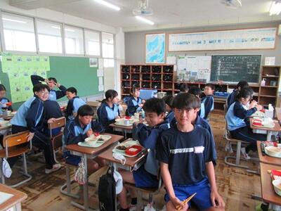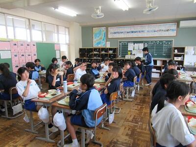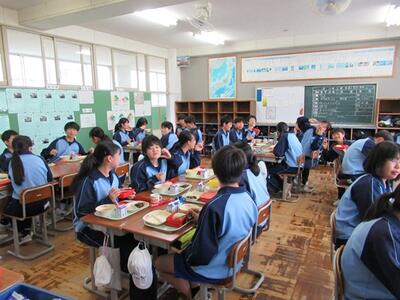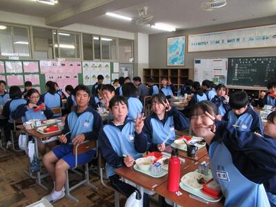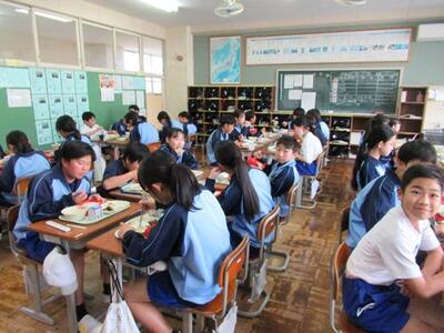 給食の様子を紹介します。グループを作り、会話しながら楽しく食べています。笑顔が多くみられます。給食がおいしいからですね。