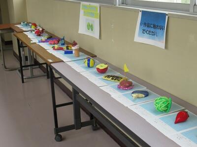 2年生が美術科の時間に作成した作品が、北校舎と南校舎の連絡通路に展示してあります。