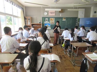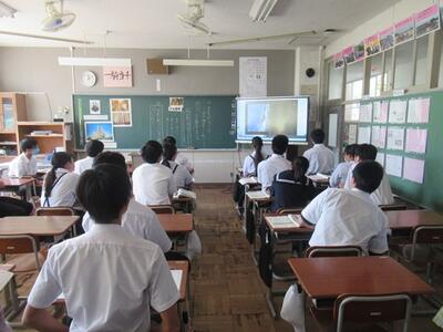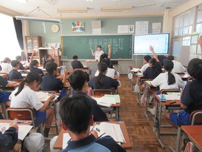 1年生の国語科では、漢字の部首について学習しました。その部首を使った漢字には何があるかを問うと、たくさんの生徒が手を挙げて答えていました。活気のある授業でした。