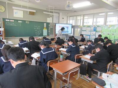 1年生の英語科では、現在進行形を学習しました。教科書の絵を見ながら、何をしているのかを考え、英語で答えていました。