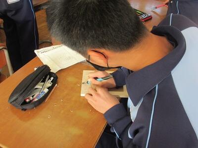 3年生の美術科では、写真フレームの作成を行っています。木枠に思い思いの彫刻を施して完成になります。素敵な作品が完成しそうです。