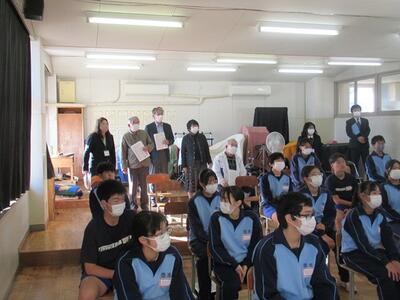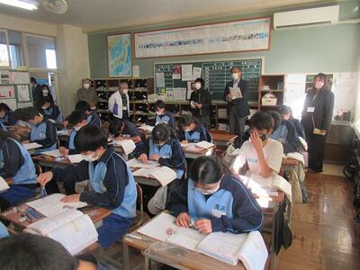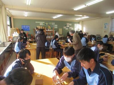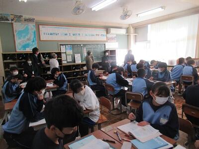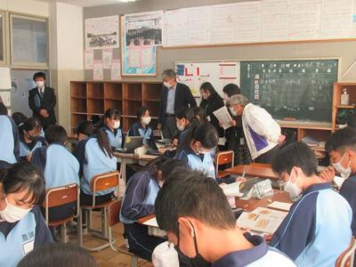 続いて、授業の様子を参観していただきました。生徒の学習態度に感心されるとともに、先生たちの授業や発問の工夫にお褒めの言葉をくださいました。