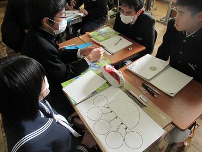 2年生の社会科では、クラゲチャートを使って日立市の町おこしについて考えを出していました。