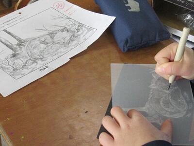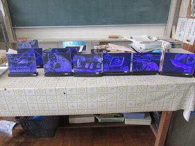 2年生の美術科では、ライトスクラッチを作成しました。ニードルで削りながら作品を完成させます。完成すると素敵な絵が光にのって浮き上がってきます。