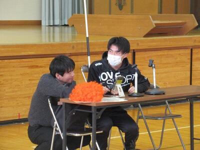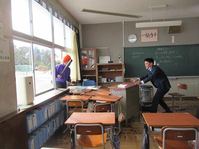避難訓練では警察署からスクールサポーターをお招きして、不審者対応について学びました。まず、サポーターが不審者となり、避難訓練を行いました。